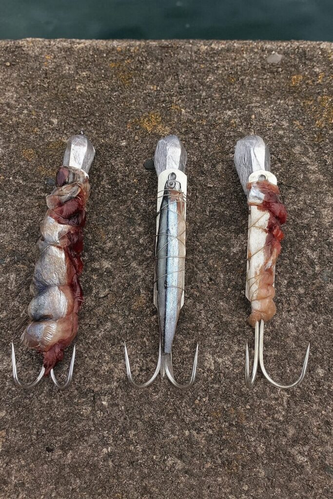 テンヤを使う場合、エサはイカ・イワシの身・サバの切り身など匂いが強いものを選び、ワイヤーでしっかり固定します。夜光テンヤや蛍光エサ止めを使うと夜釣りでのアピール力が上がります。タチウオテンヤのセッティングと似てます