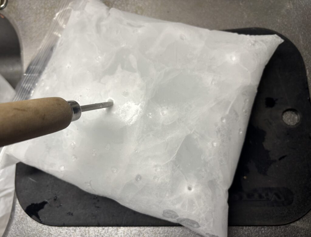 氷が完成したら、袋の上から、アイスピックと金槌で、ボコボコに叩けば、氷が砕けますし周りに飛び散らかりません。板氷で使いたい場合は、このまま使えます。