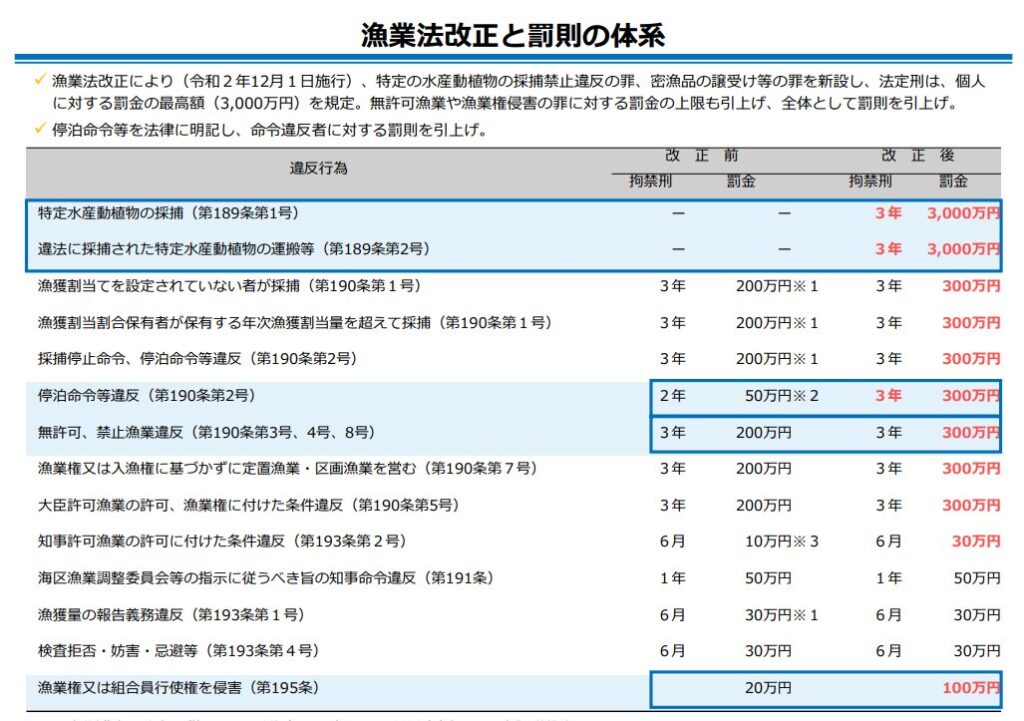 ※特定水産動植物を密漁した場合、3年以下の懲役又は3,000万円以下の罰金が科される