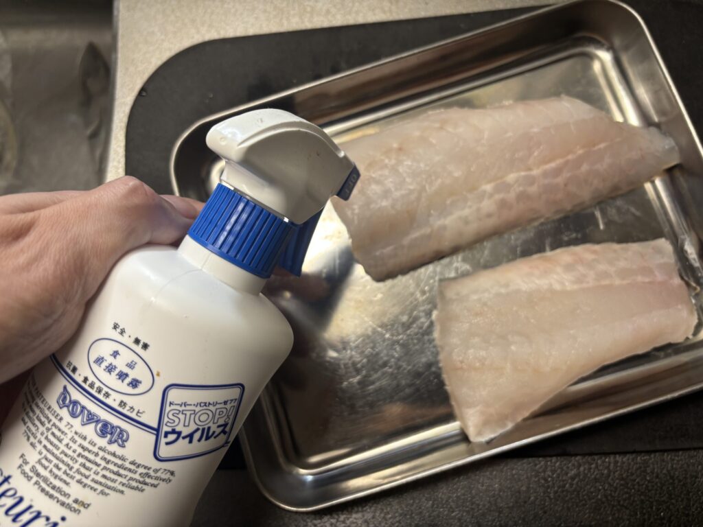 できれば数日に1回スプレーし、1分たったらふき取る。その後保存するとよいでしょう。あとは適切な温度で魚を保存できれば、10日たっても新鮮な刺身が食べれます。
