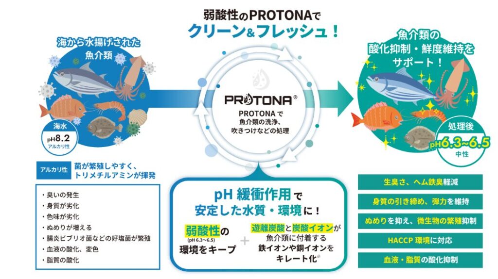 また、プロトナ水では水中の遊離炭酸や炭酸イオンの働きも活かされています。これにより、魚の表面や血液中に付着しやすい鉄イオンや銅イオンを穏やかにキレートし、酸化反応が進みにくい環境をサポートします。無理に殺菌するのではなく、「酸化や劣化が起こりにくい条件を水で作る」仕組みです。